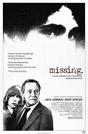 El dijous el vorem a dos pel·lícules ben diferents. La primera és Missing (USA, 1982, 120min), tot un referent del cinema polític compromés, del director greco-francès Costa-Gravras, segurament junt amb Ken Loach un dels directors més interessants del cinema polític, però a diferència de l'anglés, un director capaç de treballar amb un cinema de denúncia dins de l'estrutura dels grans estudis d'Hollywood. Missing explica la història (real) de la desaparició d'un jove periodista americà en els dies posteriors al colp d'estat amb el qual el general César Augusto Pinochet va enderrocar el govern constitucional i democràtic de Salvador Allende a Chile, l'11 de setembre de 1973. Jack Lemmon és el pare del periodista que ha de buscar, junt a la seua nora (Sissi Spacek), al seu fill al país sudamericà. La pel·lícula denuncia clarament la participació de la CIA en la preparació i execució del colp d'estat. Als Estats Units va causar un autèntic rebombori i el film va patir la persecució i els intents d'eliminar-lo de les pantalles. Però la pel·lícula va guanyar la Palma d'Or al festival de Cannes, i Jack Lemmon el de millor actor. Posteriorment també l'Oscar al millor guió adaptat (Lemmon va estar nominat al de millor actor).